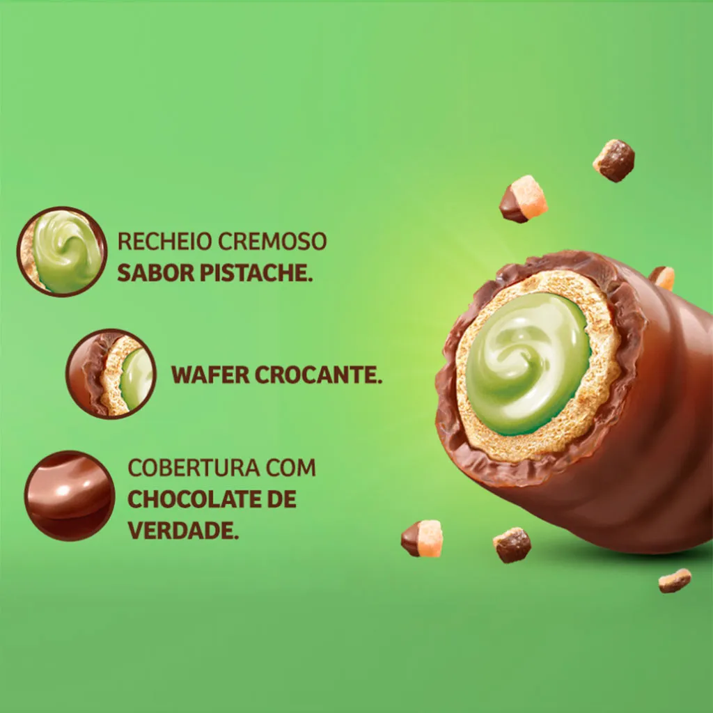 Wafer recheado com delicioso sabor pistache e coberto com chocolate, perfeito para um doce rápido e irresistível.