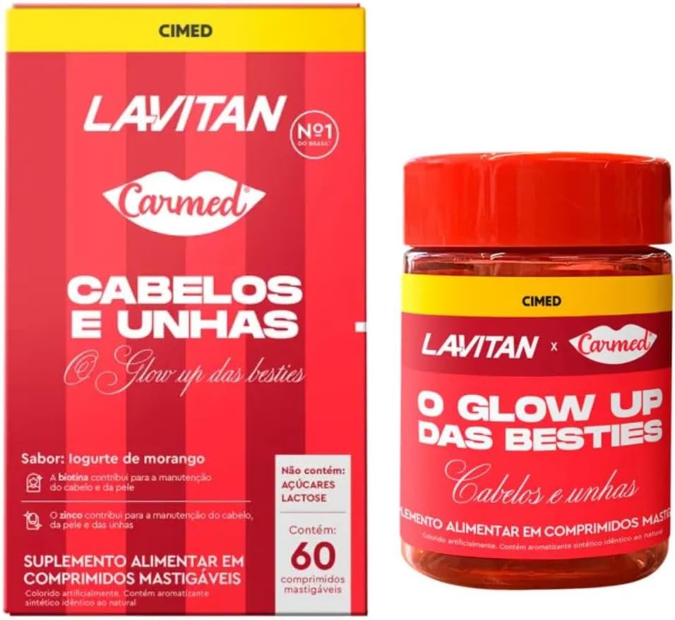 - Suplemento vitamínico desenvolvido para fortalecer cabelos e unhas e contribuir para a saúde da pele. Possui delicioso sabor iogurte de morango, trazendo praticidade e prazer ao cuidado diário. Fórmula completa com biotina, zinco e vitaminas A, C e E, além de outros nutrientes essenciais para um glow up de dentro para fora. Comprimidos mastigáveis, sem glúten e sem açúcares adicionados.